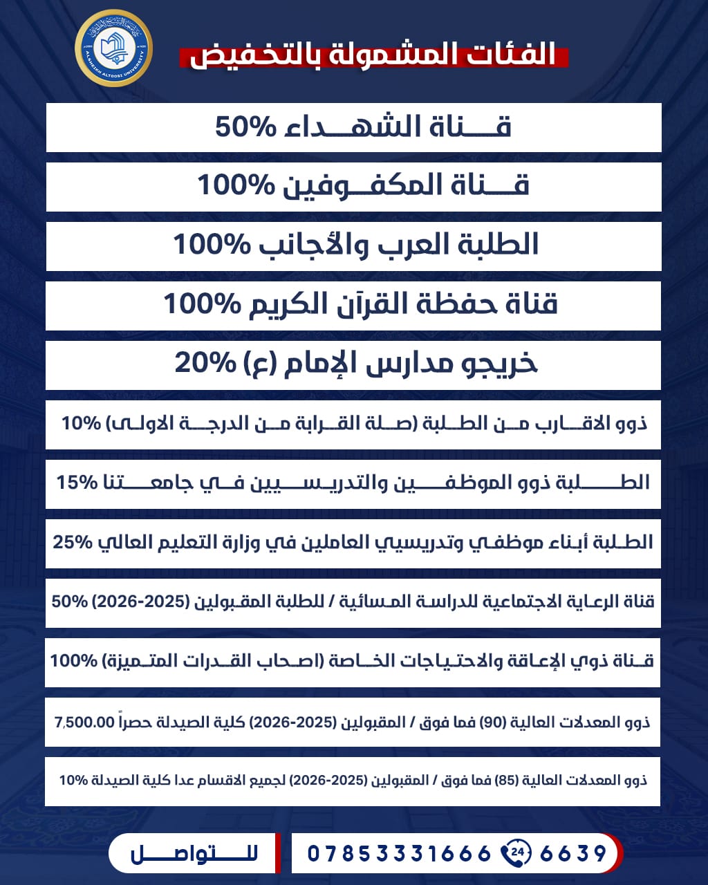 القسط السنوي موزع على أربع دفعات مريحة ،ويبلغ للدراسة الصباحي (2,000,000 دينار عراقي)، وللدراسة المسائية ، (2,000,000 دينار عراقي) فقط و هناك تخفيضات كبيرة ومتنوعة بانتظاركم!